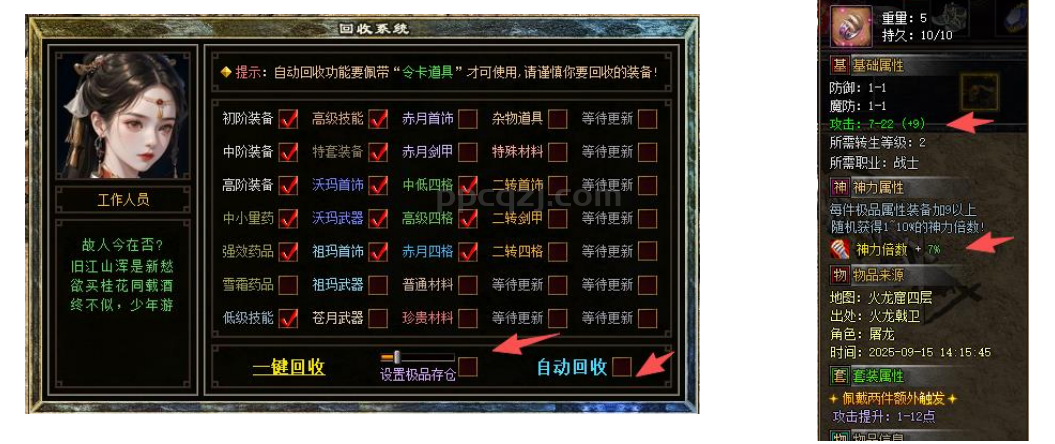 ⚫如果有条件还是建议买个月卡,要不然没办法使用自动回收与极品自动存储功 能!月卡还加攻击速度与施放技能速度!