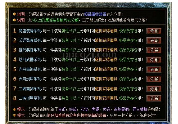 管什么垃圾装备,只要是+5以上的属性,就可以分解,把多余不要的直接分解,会给金币,经验,声望,元宝,灵符,材料等等