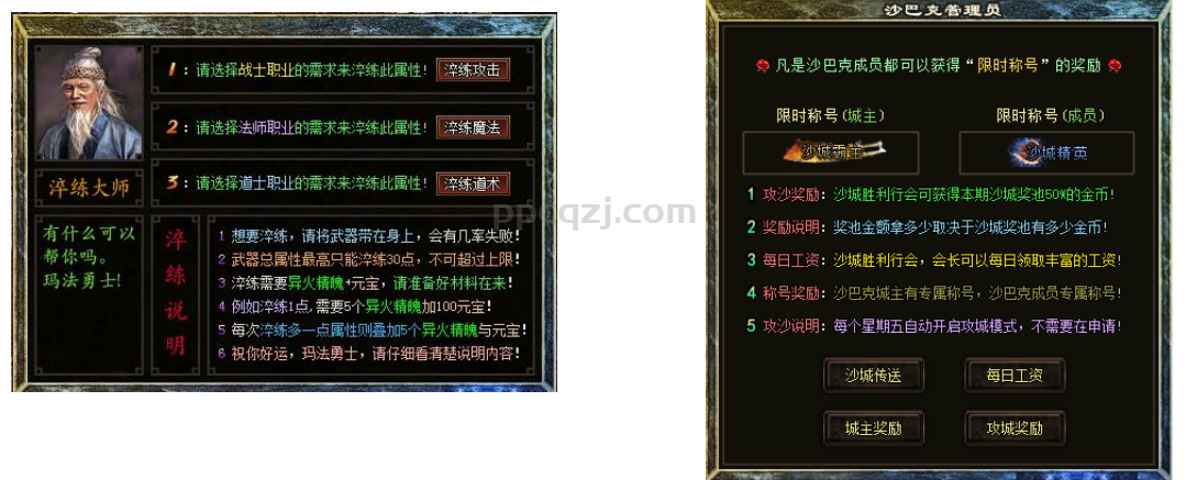 ⚫ 沙巴克武器店可以把你心爱的武器淬炼属性点数,最高可淬炼20点属性,失败武器不会破碎!