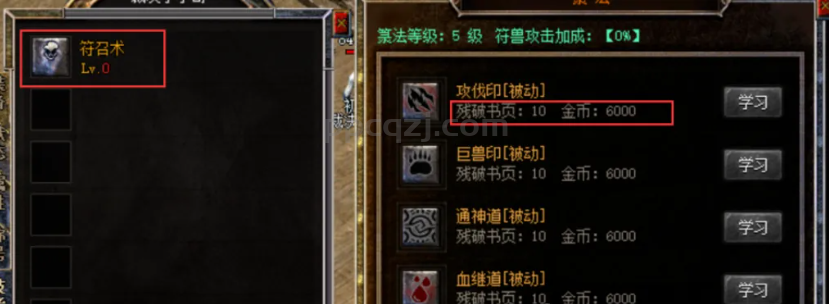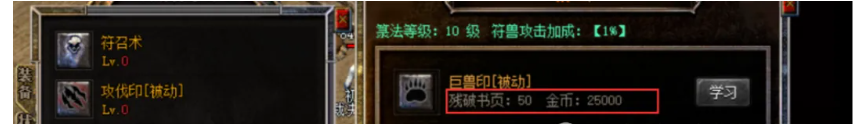 上线以后会送大家一个符召术的技能,这个技能是可以遗忘的哦,不过前期还不建议这样操作;大家这里可以看到学习第一个技能是需要10张残破书页,6000金币。
