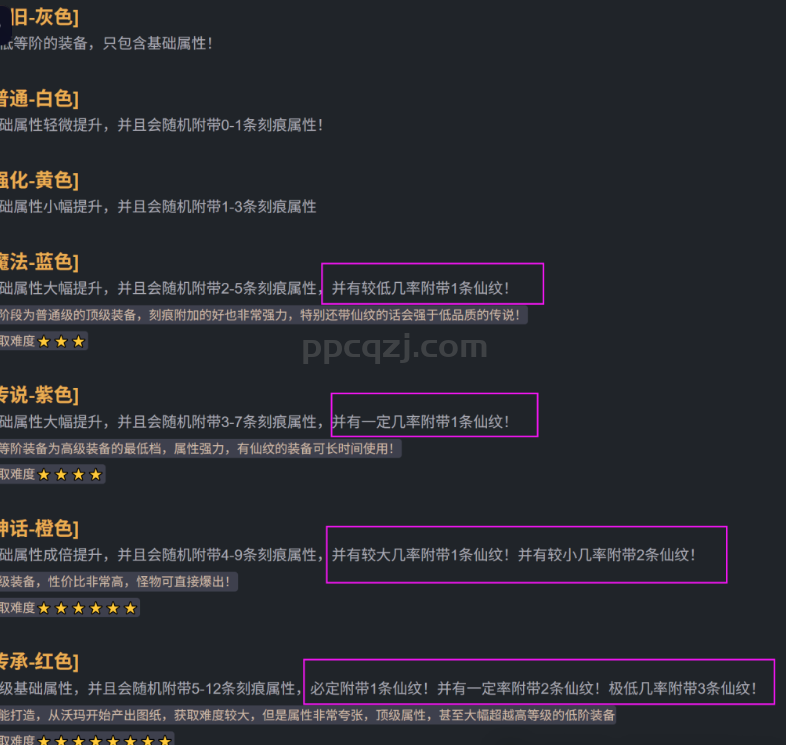 相同装备但是品阶不同,那么产出铭文的几率也不同,装备的品阶依次是:破旧→普通→精良→魔法→传说→神话→传承(目前最高阶)